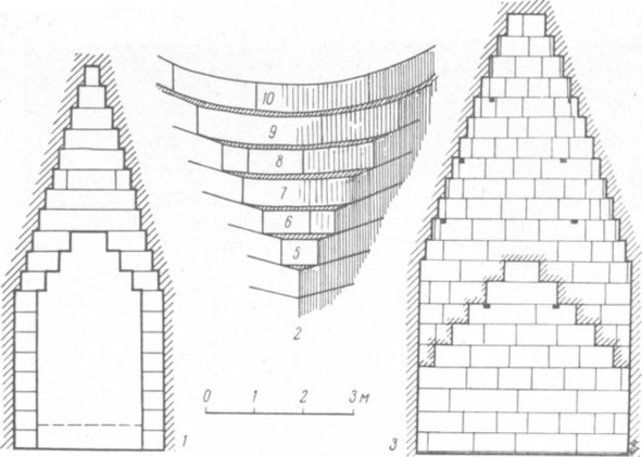 Рис. 26. Царский курган. Реконструкция камеры. 1 – вход в камеру, 2 – угловая конструкция, 3 – разрез камеры [41]