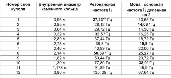 Возможные резонансы в воздухе на внутренней поверхности каменных колец, составляющих купол.