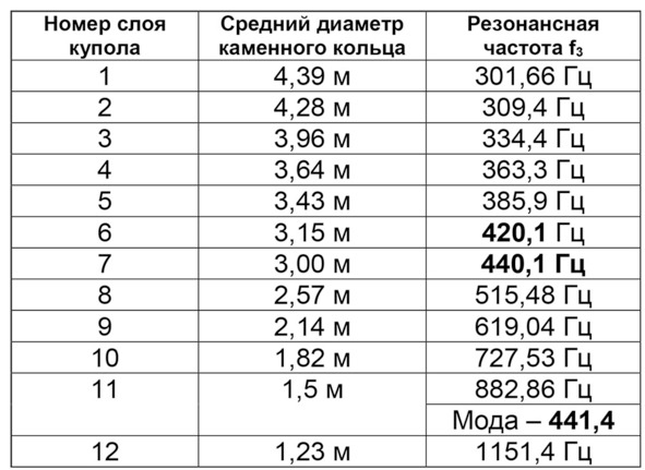 Табл. 4. Резонансные частоты внутри каменных колец купола