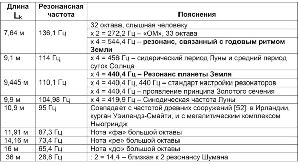 – если скорость звука составит 3962,88 Гц, то резонансная частота при длине антенны в 36 метров составит 13,76 Гц, моды (умножаем на 2 каждый раз): 27,525 Гц, 55,05 Гц, 110,1 Гц, 220,2 Гц и 440,4 Гц – а последняя частота считается главной жизненной частотой. Таким образом, не зная свойства используемых твердых материалов в антенне, невозможно точно определить резонансные частоты.