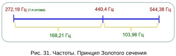 Известно, что одним из фундаментальных принципов построения живой материи является принцип Золотой пропорции. При математическом делении диапазона частот 272,19 Гц – 544,38 Гц, резонансно связанных с годовым ритмом Земли в Золотой пропорции (в отношении 61,8% и 38,2%), получаем частоту 440,4 Гц (Рис. 31).