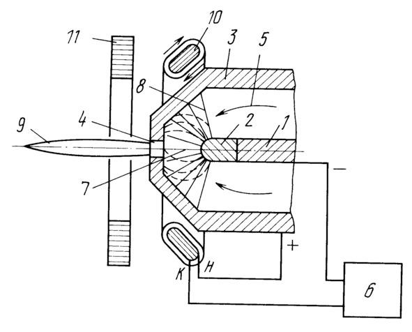 Работа происходит следующим образом. На торцовой стороне осевого металлической стержня 1 установлен тугоплавкий наконечник 2. Между тугоплавким наконечником и конусообразным корпусом горелки 3 возникает разряд. В направлении осевого канала корпуса горелки 4 подается газ или пар воды 5. Разряд возникает за счет подсоединения источника питания 6 со следующей полярностью минус на тугоплавкую вставку, плюс на корпус горелки. Плазма занимает две области; внутри в разрядном зазоре и снаружи корпуса горелки. Внутри разрядного промежутка имеются две составляющие: осевая 7 и радиальная 8. Конусообразный корпус горелки и тугоплавкая вставка разрушаются под действием обеих составляющих, но плазменный факел 9 возникает главным образом под действием осевой составляющей тока разряда, а радиальная, разрушающая канал горелки и тугоплавкую вставку в радиальном направлении является мешающей. При установке торообразной катушки 10 в область разрядного промежутка с сечением параллельным конусообразной поверхности горелки и с намоткой по радиусу возникает магнитное поле с силовыми линиями, направленными по окружности. В результате возникают силы Лоренца, перпендикулярные направлению силовых линий как энергетического поля 8, так и магнитного, и в результате заряженные частицы закручиваются или поворачиваются в область канала (траектории радиальных составляющих изменяются пунктиры на чертеже). Особенно важно это свойство для плазмотронов с парами воды, когда тугоплавкая вставка сильно разрушается по периферии, введение катушки 10 концентрирует поле к оси, а на оси устанавливается циркониевая вставка, стойкая к разряду паров воды. В результате тугоплавкая вставка разрушается значительно меньше. Полярность подсоединения катушки должна быть следующей: при намотке по часовой стрелке, начало должно быть присоединено к корпусу. Изменение полярности приводит к обратному эффекту рассеиванию разряда. Конструкция катушки 10 такова, что сечение параллельно конусообразной поверхности. Этим достигается эффект более сильного влияния катушки в области, близкой к выходному каналу и более сильная концентрация разряда к оси. Последовательное включение катушки 10 с источником питания обеспечивает свойство самостабилизации, т. е. при большем разрядном токе более сильно сказывается свойство сжатия плазмы к оси и меньше разрушение электродов и, наоборот, при меньшем разрядном токе требуется и меньшее сжатие в связи с меньшим разрушением электродов. Совокупность системы катушки 10 с радиальной намоткой и соленоида 11 с кольцевой намоткой приводит к сильной концентрации поля по оси, большему ресурсу и лучшими свойствами по сварке и резке материалов. Расстояние соленоида в 0,1—0,2 части длины плазменного факела соответствует оптимальным условиям минимального взаимного влияния двух катушек и минимального разогрева соленоида. Ресурс работы с одним тугоплавким наконечником и корпусом увеличивается в 2—3 раза.