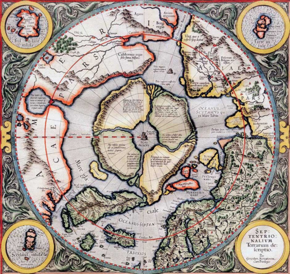 Английский мореплаватель Герард Меркатор в 1595 году издал карту, основанную, вероятно, на каких-то древних знаниях (рис. 5). На ней он изобразил побережье Северного океана и легендарную Гиперборею или Арктиду посередине. Арктика изображена в виде суши, Материк представлял собой архипелаг из нескольких островов, которые разделяют широкие реки. На карте Гиперборея изображена в виде огромного арктического материка с высокой горой Меру посередине.