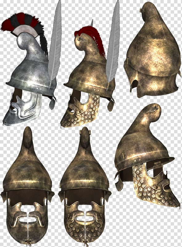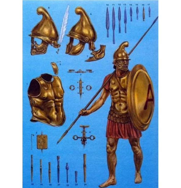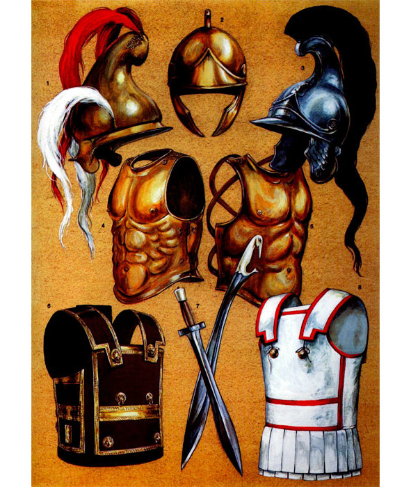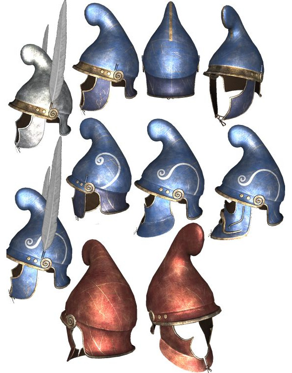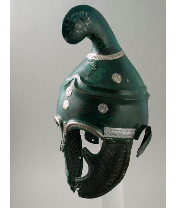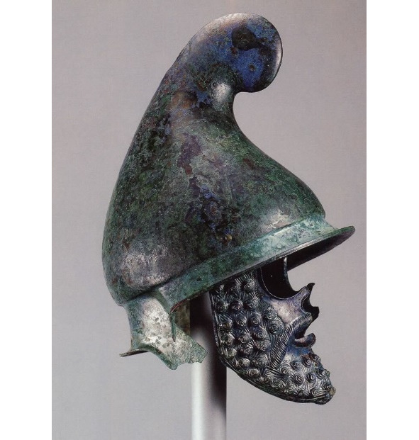 Шлемы конические, фригийского и фракийского типа с подвесным височным пластинами или без них. Носовая пластина отсутствовала всегда. Но преимущества такого шлема превышали недостаточную защиту. Шлем практически не ограничивал поле зрения и не перекрывал слух, не говоря уже о превосходной вентиляции, о чем могли только мечтать обладатели глухих коринфских шлемов.