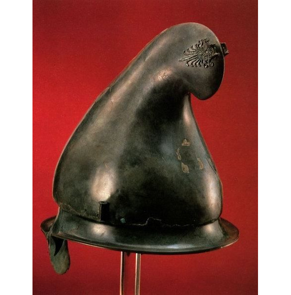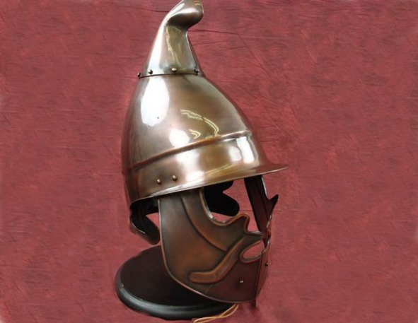 Дело в том, что это – один из вариантов противокавалерийских шлемов, рассчитанный спасать хозяина от рубящего удара махайры – основного оружия конников. Высокий гребень придает тулье сильно вытянутую форму, за счет чего появляется шанс на соскальзывание удара (если он придется вертикально), плюс – между черепом и шлемом образуется небольшая «прослойка» пустого пространства.