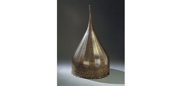Наиболее известным является русский шелом Ивана Грозного, а также шелом царевича Ивана Ивановича. Шелом Ивана Грозного (рис. 159), выкован до 1547 года. Этот стальной шлем, богато украшенный золотой насечкой, исполнен очень качественно. По форме он отличается от стандартных русских шеломов – она ближе к цилиндроконической, которая чаще встречалась в XV веке. Коническая часть разделена на узкие сектора, украшенные орнаментировкой в турецком стиле. По венцу надпись: «Шлемъ Князя Ивана Василиевича Великого Князя сына Василия Ивановича господаря всея Руси самодержца». Сейчас он хранится в Королевском арсенале в Стокгольме, где впервые упоминается в 1663 году. По одной из легенд, шелом был захвачен поляками в Смутное время, а в ходе польско-шведской войны был вывезен в Швецию. Согласно другой версии, шелом был захвачен шведами в результате боя близ замка Лоде.