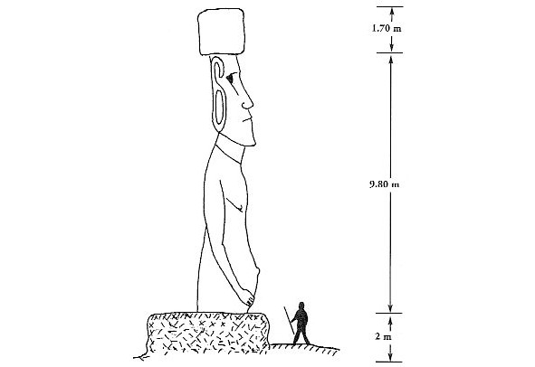 В литературе [132] приводится рисунок моаи. Он состоит из трех частей: основания высотой 2 м, корпуса статуи высотой 9,8 м и шляпы в 1,7 м – рис. 1.