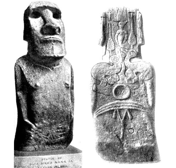 Учитывая огромное количество новодела, при обобщении свойств статуй с острова Пасхи, прежде всего учитывались старинные гравюры и старинные рисунки первооткрывателей острова в XVII, XVIII веках. Например, использовались гравюры Дюше де Ванси 1786 года (рис. 87, рис. 88).