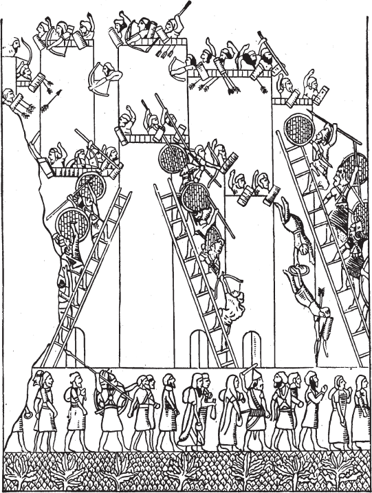 От метких стрел ассирийцев и страшного натиска колесничих не было спасения в открытом бою. Высокие стены городов также не были надёжной защитой от ассирийских воинов. Они окружали осаждённый город и кидали в него из камнеметалок тяжёлые камни или сосуды с горящей смолой. Толстые стены крепости они пробивали тараном. Это было громадное бревно, окованное медью и подвешенное на цепях, так что его можно было раскачивать и ударять им в стену. Затем ассирийцы приставляли к стенам большие лестницы и по ним проникали в город.