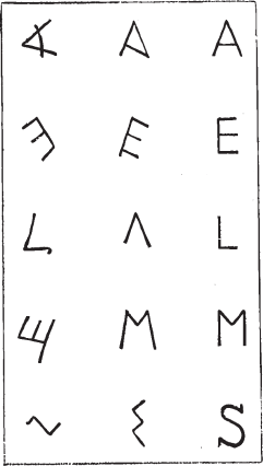Развитие алфавита: слева – финикийские буквы; в середине – древнегреческие; справа – латинские