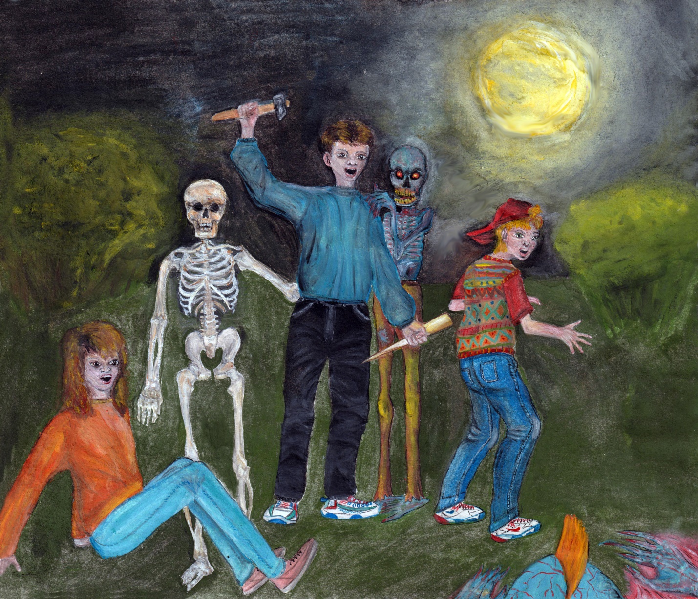 Неожиданно для себя тот встретился взглядом с мертвецом и похолодел от ужаса. Первое, что пришло в голову Юрке, это размахнуться и со всей силы ударить монстра молотком по голове, от чего нижняя челюсть отделилась от его черепа и улетела в траву. В ту же секунду Юрка оказался схвачен скелетом, подобравшимся к нему со спины. Мальчик извернулся и огрел молотком и его. Скелет рассыпался на составные части.