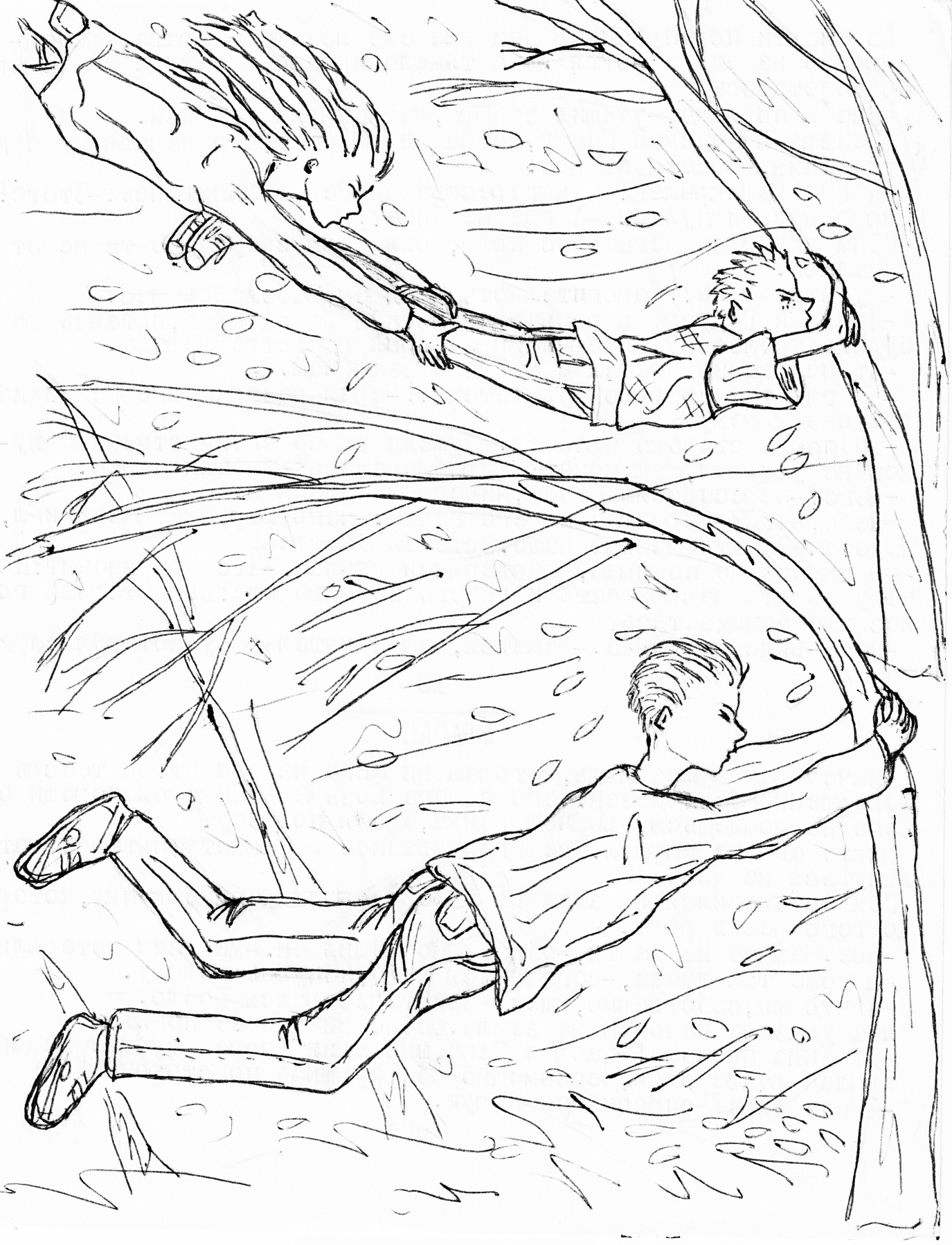 Воспользовавшись моментом, когда порывы ветра слегка стихли, ребята ухватились друг за друга и, цепляясь за стволы и ветки деревьев, продвинулись немного вперед. Куда они ползли и на что рассчитывали в этот момент, одному только Богу было известно.