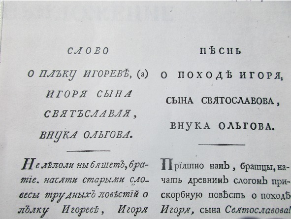 Древнеславянский текст начала поэмы в первом издании 1800 года (слева) и его перевод на современный русский язык (справа) позволяют понять, как была совершена трагическая ошибка, лишившая Россию имени ее первого поэта. Если бы переводчики в древнеславянском тексте взяли бы в кавычки слова «СЛОВО О ПЪЛКУ ИГОРЕВЬ», а затем поставили бы точку, тогда следующие слова: «ИГОРЯ СЫНА СВЯТЪСЛАВЛЯ ВНУКА ОЛЬГОВА» – безошибочно обозначили бы имя, отчество и даже «праотчество» автора великой русской поэмы.
