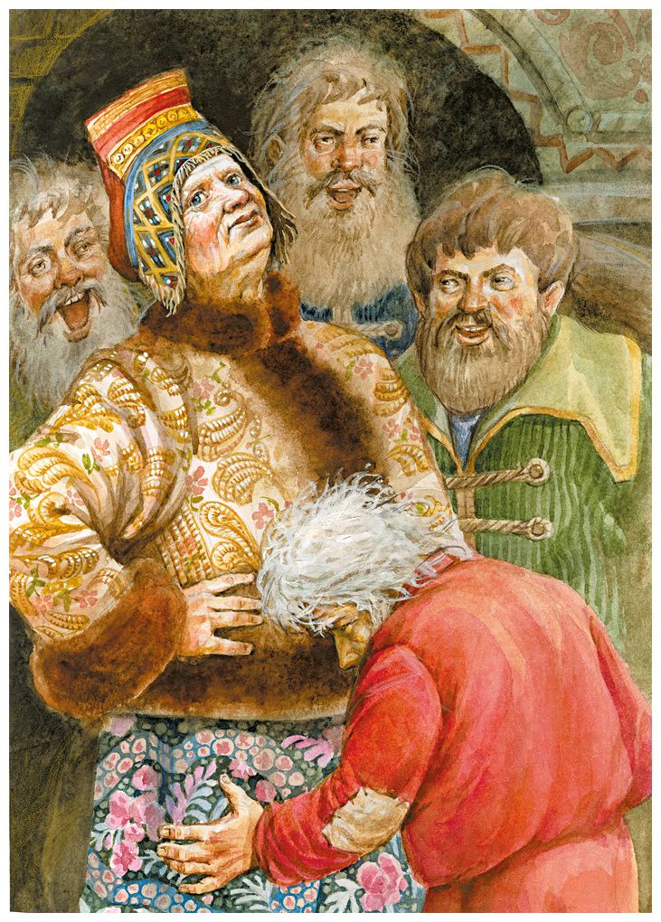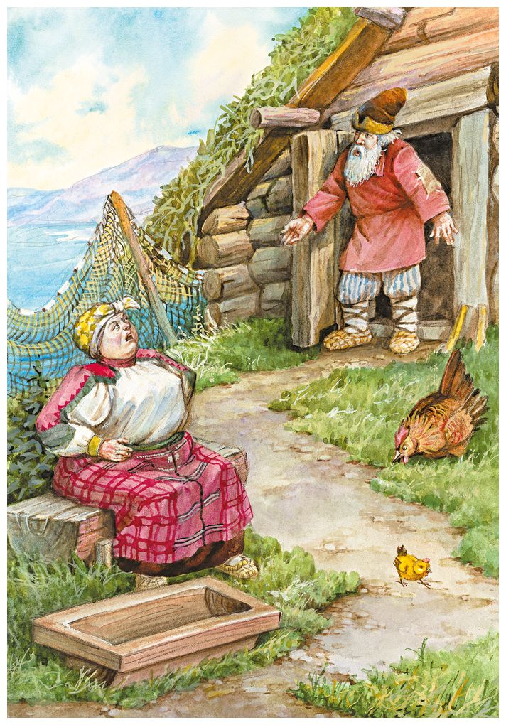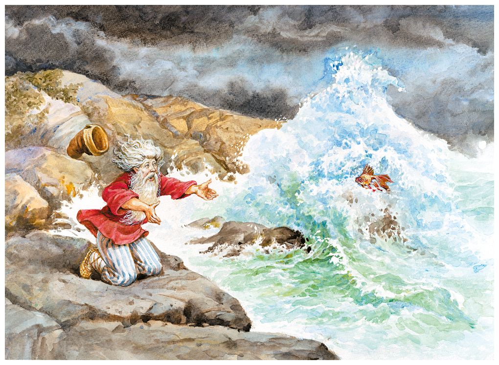 Жил старик со своею старухойУ самого синего моря;Они жили в ветхой землянкеРовно тридцать лет и три года.Старик ловил неводом рыбу,Старуха пряла свою пряжу.Раз он в море закинул невод, —Пришёл невод с одною тиной.Он в другой раз закинул невод, —Пришёл невод с травой морскою.В третий раз закинул он невод, —Пришёл невод с одною рыбкой,С непростою рыбкой, – золотою.Как взмолится золотая рыбка,Голосом молвит человечьим:«Отпусти ты, старче, меня в море!Дорогой за себя дам откуп:Откуплюсь чем только пожелаешь».Удивился старик, испугался:Он рыбачил тридцать лет и три годаИ не слыхивал, чтоб рыба говорила.Отпустил он рыбку золотуюИ сказал ей ласковое слово:«Бог с тобою, золотая рыбка!Твоего мне откупа не надо;Ступай себе в синее море,Гуляй там себе на просторе».Воротился старик ко старухе,Рассказал ей великое чудо:«Я сегодня поймал было рыбку,Золотую рыбку, не простую;По-нашему говорила рыбка,Домой в море синее просилась.Дорогою ценою откупалась:Откупалась чем только пожелаю.Не посмел я взять с неё выкуп;Так пустил её в синее море».Старика старуха забранила:«Дурачина ты, простофиля!Не умел ты взять выкупа с рыбки!Хоть бы взял ты с неё корыто,Наше-то совсем раскололось».Вот пошёл он к синему морю;Видит – море слегка разыгралось.Стал он кликать золотую рыбку,Приплыла к нему рыбка и спросила:«Чего тебе надобно, старче?»Ей с поклоном старик отвечает:«Смилуйся, государыня рыбка,Разбранила меня моя старуха,Не даёт старику мне покою:Надобно ей новое корыто;Наше-то совсем раскололось».Отвечает золотая рыбка:«Не печалься, ступай себе с Богом,Будет вам новое корыто».Воротился старик ко старухе,У старухи новое корыто.Ещё пуще старуха бранится:«Дурачина ты, простофиля!Выпросил, дурачина, корыто!В корыте много ль корысти?Воротись, дурачина, ты к рыбке;Поклонись ей, выпроси уж и́збу».Вот пошёл он к синему морю(Помутилося синее море),Стал он кликать золотую рыбку,Приплыла к нему рыбка, спросила:«Чего тебе надобно, старче?»Ей старик с поклоном отвечает:«Смилуйся, государыня рыбка!Ещё пуще старуха бранится,Не даёт старику мне покою:Избу просит сварливая баба».Отвечает золотая рыбка:«Не печалься, ступай себе с Богом;Так и быть: изба вам уж будет».Пошёл он ко своей землянке,А землянки нет уж и следа;Перед ним изба со светёлкой,С кирпичною, белёною трубою,С дубовыми, тесовыми вороты.Старуха сидит под окошком,На чём свет стоит мужа ругает:«Дурачина ты, прямой простофиля!Выпросил, простофиля, избу!Воротись, поклонися рыбке:Не хочу быть чёрной крестьянкой,Хочу быть столбовою дворянкой».Пошёл старик к синему морю(Неспокойно синее море);Стал он кликать золотую рыбку.Приплыла к нему рыбка, спросила:«Чего тебе надобно, старче?»Ей с поклоном старик отвечает:«Смилуйся, государыня рыбка!Пуще прежнего старуха вздурилась,Не даёт старику мне покою:Уж не хочет быть она крестьянкой,Хочет быть столбовою дворянкой».Отвечает золотая рыбка:«Не печалься, ступай себе с Богом».Воротился старик ко старухе.Что ж он видит? Высокий терем.На крыльце стоит его старухаВ дорогой собольей душегрейке,Парчовая на маковке кичка,Жемчуги огрузили шею,На руках золотые перстни,На ногах красные сапожки.Перед нею усердные слуги;Она бьёт их, за чупрун таскает.Говорит старик своей старухе:«Здравствуй, барыня-сударыня дворянка!Чай, теперь твоя душенька довольна».На него прикрикнула старуха,Н
