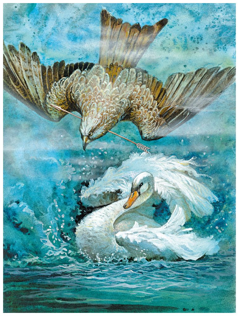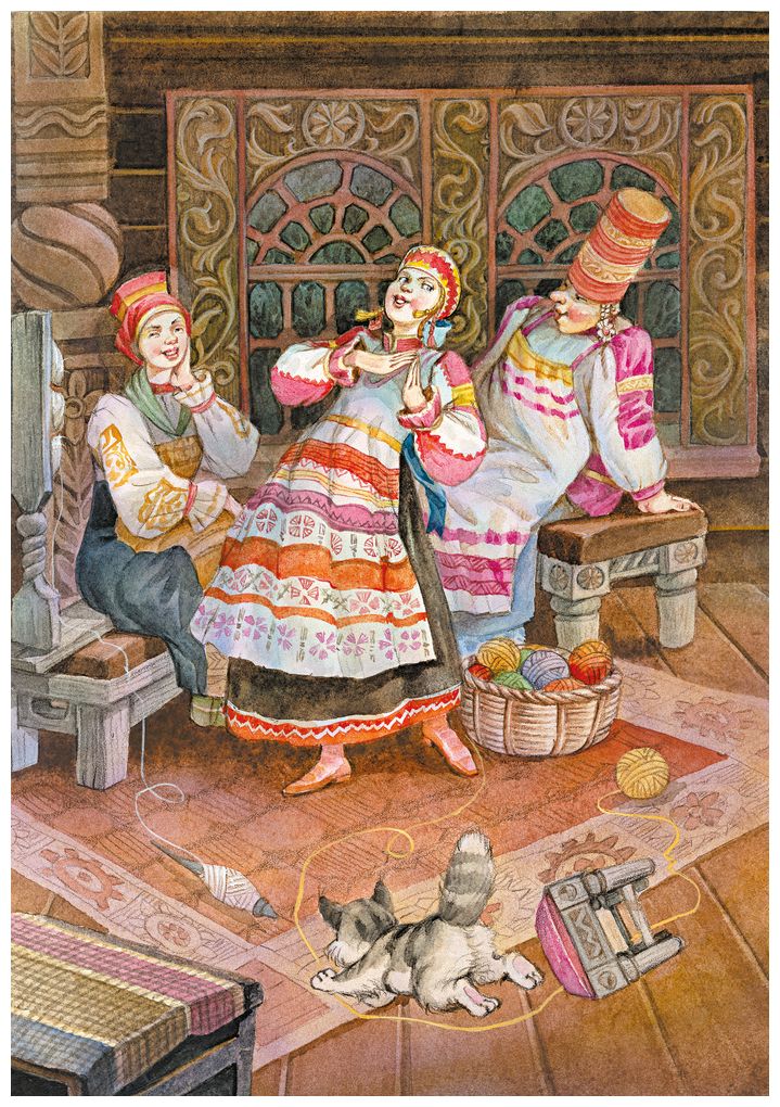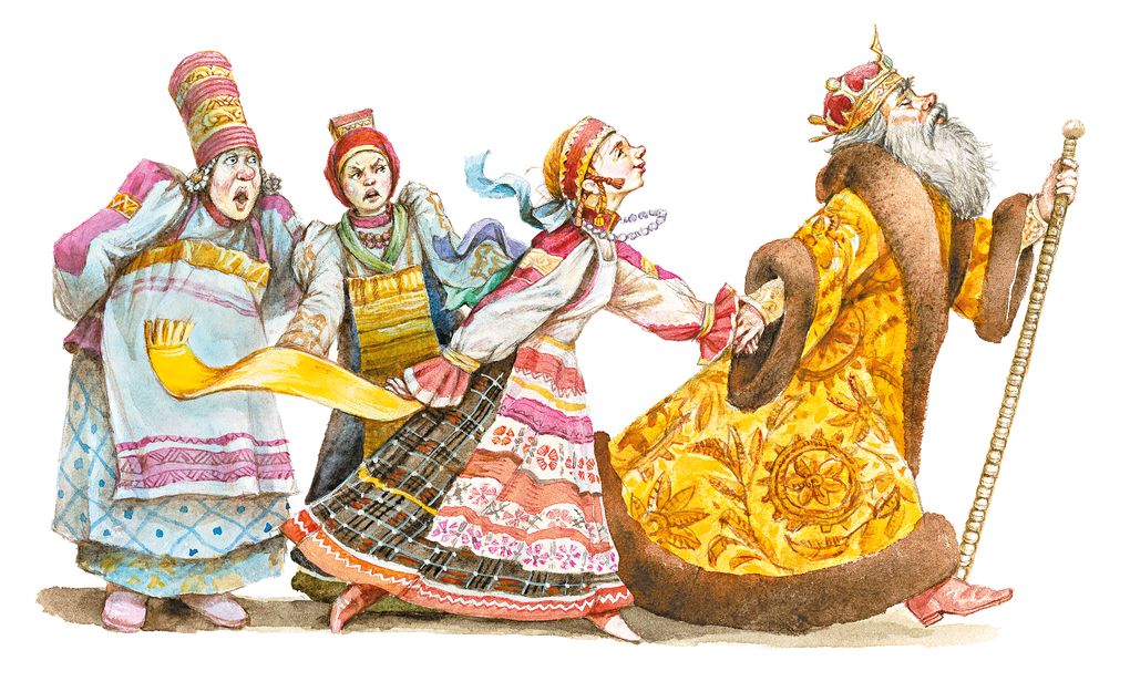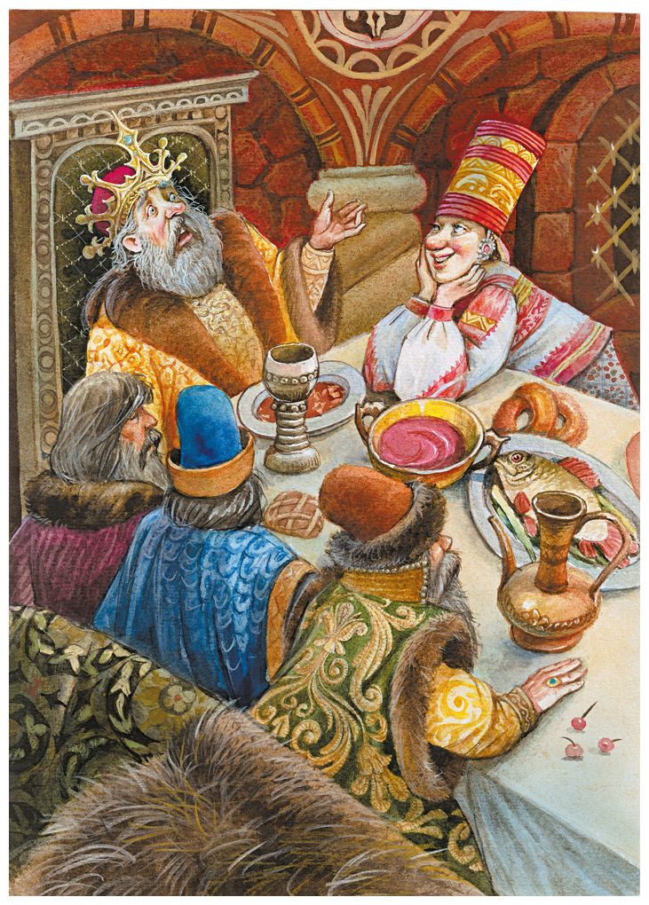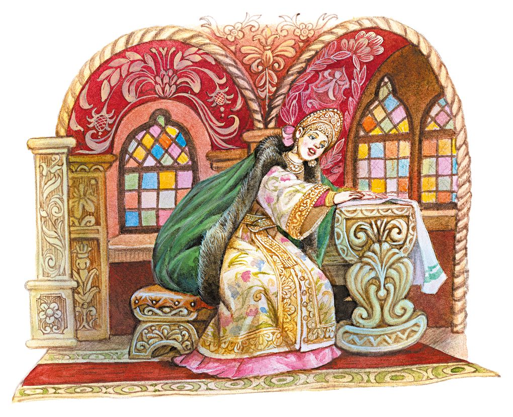 Три девицы под окномПряли поздно вечерком.«Кабы я была царица, —Говорит одна девица, —То на весь крещёный мирПриготовила б я пир».«Кабы я была царица, —Говорит её сестрица, —То на весь бы мир однаНаткала я полотна».«Кабы я была царица, —Третья молвила сестрица, —Я б для батюшки-царяРодила богатыря».Только вымолвить успела,Дверь тихонько заскрыпела,И в светлицу входит царь,Стороны той государь.Во всё время разговораОн стоял позадь забора;Речь последней по всемуПолюбилася ему.«Здравствуй, красная девица, —Говорит он, – будь царицаИ роди богатыряМне к исходу сентября.Вы ж, голубушки-сестрицы,Выбирайтесь из светлицы.Поезжайте вслед за мной,Вслед за мной и за сестрой:Будь одна из вас ткачиха,А другая повариха».В сени вышел царь-отец.Все пустились во дворец.Царь недолго собирался:В тот же вечер обвенчался.Царь Салтан за пир честнойСел с царицей молодой;А потом честны́е гостиНа кровать слоновой костиПоложили молодыхИ оставили одних.В кухне злится повариха,Плачет у станка ткачиха,И завидуют онеГосударевой жене.А царица молодая,Дела вдаль не отлагая,С первой ночи понесла.В те поры война была.Царь Салтан, с женой простяся,На добра коня садяся,Ей наказывал себяПоберечь, его любя.Между тем, как он далёкоБьётся долго и жестоко,Наступает срок родин;Сына Бог им дал в аршин,И царица над ребёнком,Как орлица над орлёнком;Шлёт с письмом она гонца,Чтоб обрадовать отца.А ткачиха с поварихой,С сватьей бабой БабарихойИзвести её хотят,Перенять гонца велят;Сами шлют гонца другогоВот с чем о́т слова до слова:«Родила царица в ночьНе то сына, не то дочь;Не мышонка, не лягушку,А неведому зверюшку».Как услышал царь-отец,Что донёс ему гонец,В гневе начал он чудеситьИ гонца хотел повесить;Но, смягчившись на сей раз,Дал гонцу такой приказ:«Ждать царёва возвращеньяДля законного решенья».Едет с грамотой гонецИ приехал наконец.А ткачиха с поварихой,С сватьей бабой БабарихойОбобрать его велят;Допьяна гонца поятИ в суму его пустуюСуют грамоту другую —И привёз гонец хмельнойВ тот же день приказ такой:«Царь велит своим боярам,Времени не тратя даром,И царицу и приплодТайно бросить в бездну вод».Делать нечего: бояре,Потужив о государеИ царице молодой,В спальню к ней пришли толпой.Объявили царску волю —Ей и сыну злую долю,Прочитали вслух указИ царицу в тот же часВ бочку с сыном посадили,Засмолили, покатилиИ пустили в окиян —Так велел-де царь Салтан.В синем небе звёзды блещут,В синем море волны хлещут;Туча по небу идёт,Бочка по морю плывёт.Словно горькая вдовица,Плачет, бьётся в ней царица;И растёт ребёнок тамНе по дням, а по часам.День прошёл – царица во́пит…А дитя волну торопит:«Ты, волна моя, волна!Ты гульлива и вольна;Плещешь ты, куда захочешь,Ты морские камни точишь,Топишь берег ты земли,Подымаешь корабли —Не губи ты нашу душу:Выплесни ты нас на сушу!»И послушалась волна:Тут же на берег онаБочку вынесла легонькоИ отхлынула тихонько.Мать с младенцем спасена;Землю чувствует она.Но из бочки кто их вынет?Бог неужто их покинет?Сын на ножки поднялся,В дно головкой уперся,Понатужился немножко:«Как бы здесь на двор окошкоНам проделать?» – молвил он,Вышиб дно и вышел вон.Мать и сын теперь на воле;Видят холм в широком поле;Море синее кругом,Дуб зелёный над холмом.Сын подумал: добрый ужинБыл бы нам, однако, нужен.Ломит он у дуба сукИ в тугой сгибает лук,Со креста снурок ш