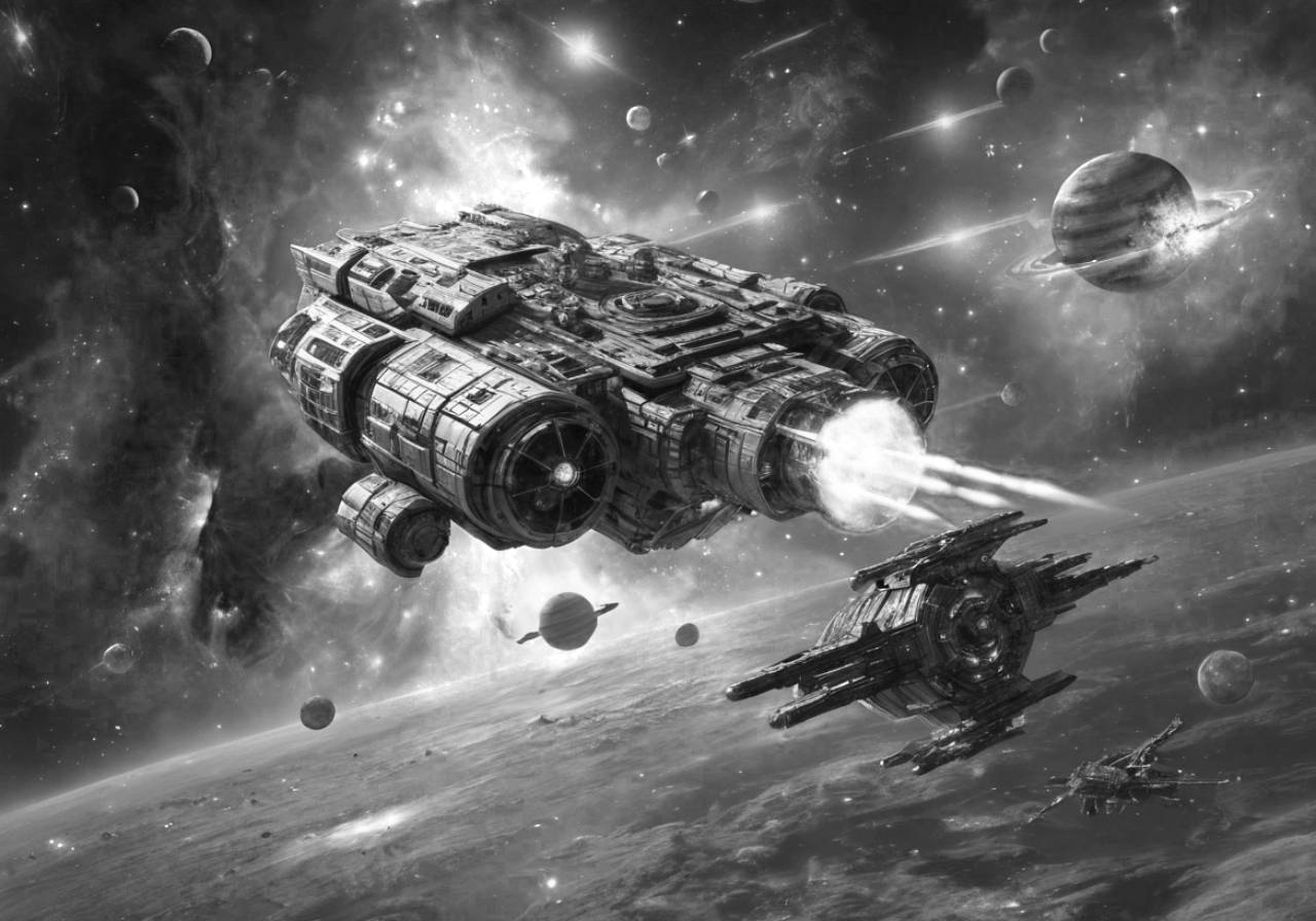 Из трех наших кораблей два боевых крейсера с десантом, истребительными соединениями и планетарными войсками; третий – космический лайнер со стотысячной ордой колонистов, навербованных под нашими лозунгами в десятке миров. Каждый корабль – путешествующая планета со всем необходимым на необъятном борту, гигантский, но стройный организм человеко – машинного происхождения.
