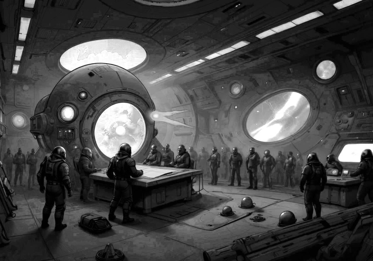 У радаров собрался весь командный состав, гам и разговоры прервались, как только появились эльгры. На одном из мониторов внутреннего наблюдения можно было видеть, как инопланетники копошатся в машинном отделении. Они выполняли всё в полном объёме, не пользуясь роботами. Офицеры удивлённо наблюдали за ними, Уэсшеракх объяснил: «Всю ответственную работу делают специальные солдаты – техники. Доверять машины машинам нам кажется неразумным поступком»