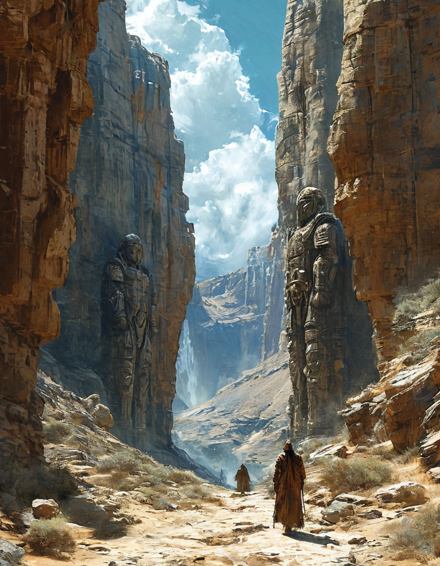 Оказалось, у основания горы находился проход в каньон через горы. Пустынные растения росли повсюду, придавая этому месту свою эстетику. У входа в каньон стояли две величественные статуи, искусно выдолбленные из камня, высотой порядка 150 метров. Казалось, что им не одна тысяча лет, но даже сейчас они выглядели как живые стражи, охраняющие вход в этот каньон, или же предупреждение для тех, кто пытается пройти в земли за каньоном. Курту с высоты горы казалось, что эти статуи наблюдают за ним, готовые в любую секунду выйти из своих каменных стен и растоптать всё, что окажется у них под ногами.