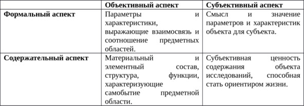 И наконец, предваряя дальнейшие рассуждения, напомню о том, что познание предполагает два аспекта: формальный и содержательный. И каждый из них должен раскрываться с двух сторон: объективно и субъективно. В этом случае, результат исследований становится многомерной моделью, адекватно характеризующей как самобытность предмета, так и его ценностно-смысловое наполнение.