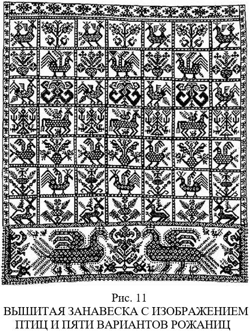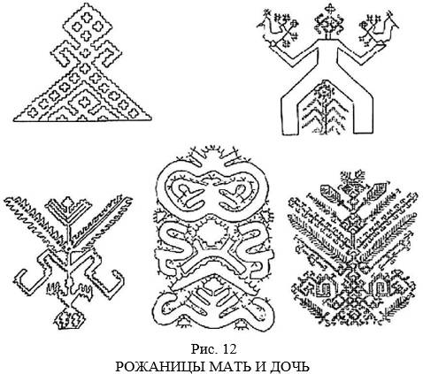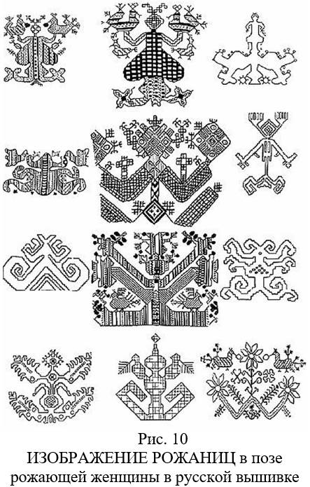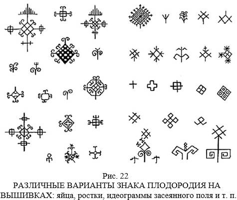 «Связь ромбо-точечного узора со свадебной обрядностью и с бытом молодой замужней женщины заставляет нас обратить на него особое внимание, так как весь свадебный ритуал пронизан магическим содержанием, и в первую очередь магией плодородия. Общеизвестно, что идея плодородия в свадебной обрядности выступает в двух формах: во-первых, как будущая плодовитость девушки-невесты, а во-вторых, как плодовитость вспаханной и засеянной земли (каравай хлеба, обсыпание зерном, подстилание соломы и т. п.). Женщина уподоблена земле, рождение ребенка уподоблено рождению нового зерна, колоса. В этом слиянии аграрного и женственного начал сказывается не только внешнее уподобление по сходству сущности жизненных явлений, но и стремление слить в одних и тех же заклинаниях и благопожеланиях счастье новой семьи, рождение новых людей и урожайность полей, обеспечивающую это будущее счастье. Здесь мы видим тот самый комплекс, который выражался в древней Руси понятием "рожаницы" – покровительницы как рождаемости, так и урожайности»13.
