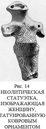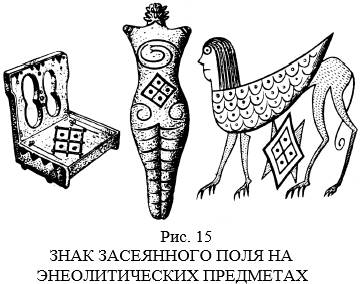 «Ромб появился в позднепалеолитическом искусстве как сознательное воспроизведение рисунка мамонтовой кости, как обобщенный символ мамонта-блага. Осмысление рисунка дентина было, надо полагать, таким же повсеместным, как повсеместна была охота на мамонта. При посредстве ритуальной татуировки (когда простенькие печатки создавали на теле очень сложные варианты меандрового узора) ромбический орнамент пережил бытование мамонтовой кости и дожил до земледельческой эпохи. В земледельческих культурах Европы ромбо-меандровый орнамент применялся и как магический общий фон на ритуальных предметах, и как отдельный знак, обособленный символ плодородия. Тот знак "засеянного поля", с которого мы начали первый экскурс в глубину памяти, оказался не первоначальным, не самым древним, а одним из последующих звеньев той длинной цепи, начало которой уводит нас еще на несколько тысячелетий вглубь. Ромбический знак, известный во многих вариантах, выражал земледельческую идею земного, растительного плодородия; ромб оброс по углам отростками (ромб с крючками), в чем сказалась его новая, аграрная сущность»12.