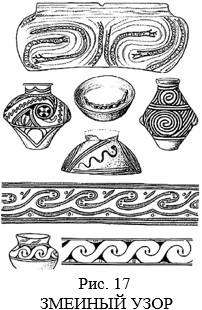 Неоэнеолитический орнамент, столь широко использующий змей, убедительно свидетельствует о прочном культе безвредных ужей, с которыми связывалось представление о дожде и об охране жилища (в частности, от мышей)»15.