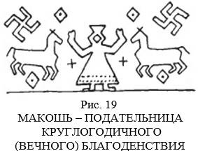 Загадочным остается для исследователе культ Макоши: «Полного тождества между Макошью и теми богинями, с которыми прямо или косвенно можно ее сопоставлять, нет, но у нее много черт, роднящих ее и с Гекатой, и с Фрейей, и с Афродитой. Все говорит за то, что Макошь (задолго до того, как она стала лишь покровительницей женских работ) была очень важной богиней праславянского пантеона, что и отмечено скульптором Збручского идола»16.