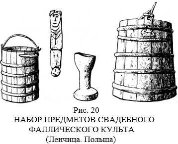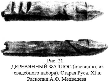 Фаллические идолы встречаются у восточных славян в других местах, а фаллические обряды, описанные в русских источниках XI–XII вв. (погружение изображения фаллоса в ведро), подтверждены находками в Польше»24.