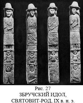 «Четырехгранность Збручского идола, несомненно, связана с очень древними, еще неолитическими, представлениями о необходимости обезопасить себя «со всех четырех сторон». Четырехгранные и четырехликие славянские идолы известны в этих же местах уже в IV в. н. э. Если три яруса идола объединяют все три части Вселенной, то четырехгранность его также связана с его мировым смыслом – сила божества должна распространяться во все четыре стороны Вселенной. Таков же, вероятно, смысл и четырехликого индийского Варуны и четырехликого Брамы.