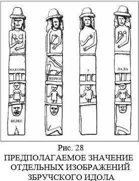 Рыбаков замечает, что «внутренний смысл Збручского идола, его отдельных изображений и всей их совокупности в целом будет, вероятно, еще долгое время предметом изучения и дискуссий»22. Вместе с тем, он делает попытку объяснить композицию со своей точки зрения: