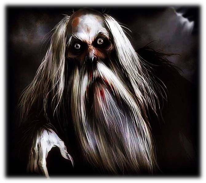Сашка тут же вскакивает и крадется на цыпочках в кухню. А там…Ярко светит в окно Луна и в ее свете…На полу разлито молоко, разбросаны черепки глиняного кувшина, осколки тарелок и чашек, оборвана занавеска и сломан табурет. А под потолком парит серый старичок с длинными седыми, растрепанными волосами. Внезапно старичок оборачивается к Сашке.