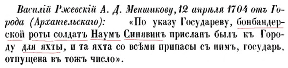 10 мая 1704 года Государь прибыл на Олонецкую верфь, где ему были приготовлены царские хоромы. Александр Меншиков пишет в письме Петру: «… и я те снасти для яхты послал с Наумом Синявиным». Тут надо довести до читателя ещё ряд документов того времени.