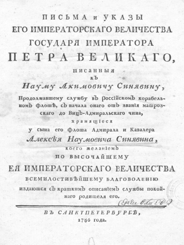Сохранились письма Ульяна Синявина к Александру Меншикову из Нарвы датированные 11 июнем в котором он пишет: «…на селицком рядку судно по чертежам сделано, да 4 судна каковы деланы в Шлиссельбкрге, только каюты большие и приведены в Ладогу и оснащают, а как сделают то будут в С. Петербурге… да 10 судов на чем возят камень сделаны… лесу у судов дела еще будет судов на 20». В те времена фамилия Синявина писалась только через букву «и».