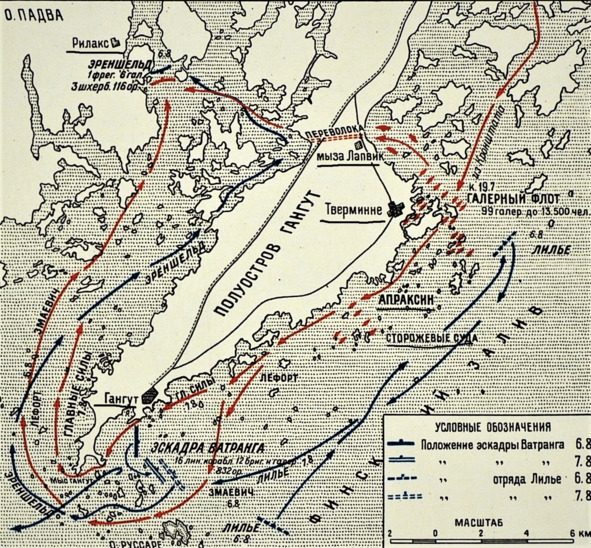22 июля Государь находился с флотом у полуострова Гангут (по-шведски Hangö udd) лично производил рекогносцировку окрестностей в узком месте. К группе островов, расположенных посредине мыса, было послано 15 скампавей, которые должны были следить за противником. При обследовании полуострова у мызы Лапвик было найдено удобное место для перетаскивания скампавей сухим путем. Расстояние между берегами равнялось здесь всего 2 с половиной версты. У Петра Алексеевича родилась оригинальная идея устроить в узком месте «переволоку и перетащить по ней часть легких галер» и зайти противнику в тыл, а там как будет «неприятеля привесть в камфузию». Что было и сделано русской пехотой.