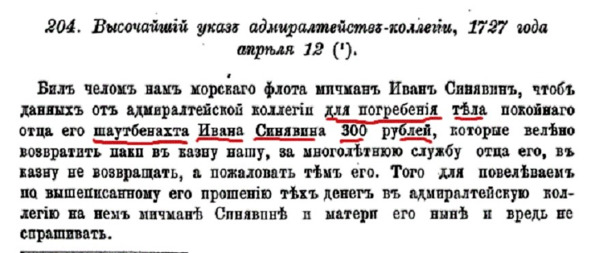 Наум Акимович помог своему племяннику в дальнейшем продвижении по службе и 4 мая «За многолетнюю службу отца и что служил на Каспийском море у смотра новозавоеванных крепостей и описания морских берегов в кампанию 1726 года», мичман Иван Иванович Синявин произведён в «унтер-лейтенанты до вакансии, без баллотирования, другим не в образец». Ему перешёл во владение дом на Мойке в Москве. Младшему брату Николаю был всего один год, а сестре Анне Ивановне 18 лет.