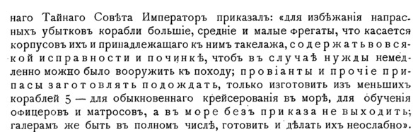3. Но паче от умаления флота неприятелю силы прибудет, ибо хотя б и Российский флот никаких знатных действ учинить в состоянии не был, то однакож, пока оной есть, в случае войны неприятель принужден для своей безопасности такой же флот вооружить и всегда не токмо в готовности иметь, но и в море держать к великому своему убытку и крайнему разорению, отчего он освободится, когда от Россейского флота больше опасения не имеет, и тако на вооружение флота поребные иждивении в другом месте против Росии употреблять может.