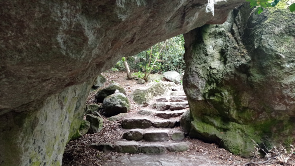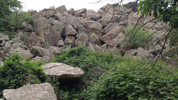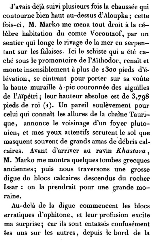 Я проходил мимо большого и красивого пруда с форелью облицованного гранитом; всё это восхищает глаз, но не объясняет мне, откуда всё же взялись эти каменные глыбы. Наконец говорит мне мой гид, вы только что видели на самом деле самые красивые растения и зелень парков. Посмотрите на это сияющее море… теперь повернитесь и сделайте несколько шагов. Невозможно с такого малого расстояния увидеть, как быстро меняется природа формами более богатыми своими творениями на более дикие, печальные и пугающие варианты, я чувствовал себя подавленным, но в то же время радостным, что нашёл разгадку… Я нахожусь в глубине настоящего вулканического кратера совершенно нового типа: стены из гранитных глыб, сложенные друг над другом, угловатые и округлые образуют настоящий воронкообразный кратер в сланцевых породах, которые упираются в стенки. Одна глыба, окружённая старыми оливковыми деревьями поднимается над нами на 100 футов. Диаметр кратера в его верхней части составляет несколько сотен шагов. Дно воронки выложено глыбами и нигде не видно камня на месте. Внизу под большими камнями, бьёт источник, который невозможно не заметить и который ниже образует водораздел, прилегающий к кратеру. Второй кратер недалеко от первого открывается у большой сланцевой стены под самой деревней Алупка. Возвышающаяся над всем этим Ай-Петри с руинами, каменными иглами как бы угрожает небесам. Обе воронки имеют понижение в сторону берега моря, и возвышаются над ним на 200 футов и вероятно офитовый гранит ранее образовывал ровный пласт. Сильное землетрясение раскололо эту породу и выбросило обломки камней наружу, раскидав их вокруг точки извержения. Некоторые из гранитных глыб диаметром от 15 до 20 футов и более выкатились дальше по сланцевому склону, вплоть до морского берега; именно они придают саду такой живописный вид; никаких каменных глыб не видно выше этих кратеров. Такова Алупка, виноградники которой насчитывают 24000 виноградных лоз, из которых 200 сортов были завезены (Воронцовым-А.Ф.) в Крым для различных целей выращивания; 1500 оливковых деревьев, посаженных за последние несколько лет, обещают самые высокие урожаи. На самом деле от древней Алупки остались только руины небольшого греческого форта, на месте где построен новый дворец. В глиняном горшке было пять золотых монет или медалей с почти неразборчивыми надписями на греческом языке. На одной стороне было изображение Иесуса, а на другой святой Иоанн и дева Мария»38.