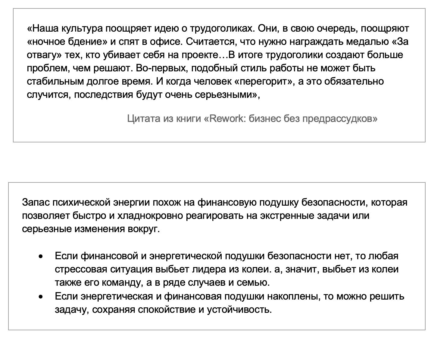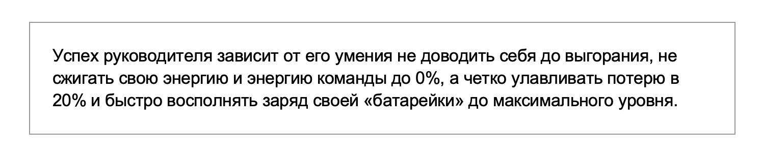 Регулярные способы восстановления энергии – качественный сон (не меньше восьми часов в сутки), хобби, спорт, активный отдых (развлечения; культурные мероприятия; время, проведенное с семьей), сильное окружение и поддерживающая среда в профессиональном сообществе, общение с близкими, с наставниками, партнерами, коучами, психологами, другие помогающие практики.