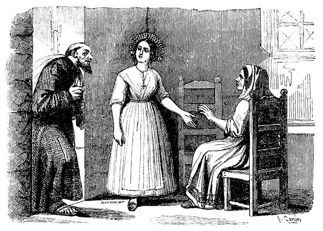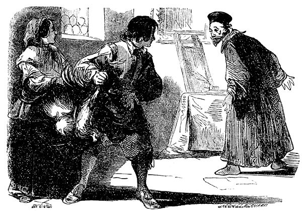 Тут появилась Лючия. В переднике у нее было столько орехов, что она с трудом несла их, напрягая вытянутые руки, которыми крепко держала высоко поднятые углы передника. В то время как фра Гальдино, снова скинув с плеч мешок, опустил его на пол и начал раскручивать, чтобы всыпать в него щедрую милостыню, мать удивленно и строго посмотрела на Лючию, как бы укоряя ее за расточительность; но Лючия отвечала взглядом, словно говорившим: «Погодите, я все объясню потом». Фра Гальдино стал рассыпаться в восхвалениях, пожеланиях, обещаниях, благодарностях и, водворив мешок на место, собрался было уходить. Но Лючия остановила его словами: