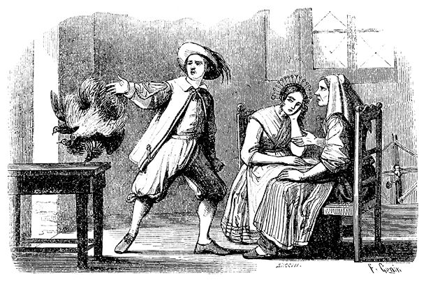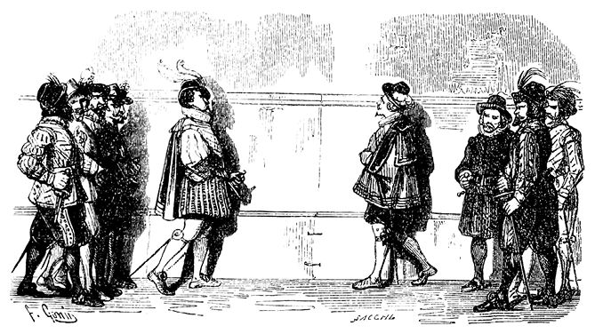 Брави той и другой стороны остановились, каждый стал позади своего патрона; взявшись за шпаги, поглядывая друг на друга исподлобья, они приготовились к бою. Народ, подходивший с обеих сторон, держась на почтительном расстоянии, смотрел на это зрелище. Присутствие зрителей еще больше раззадоривало соперников.