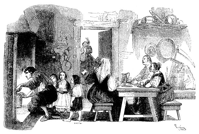 Страдания оттачивают ум. И Ренцо, который на ровном и спокойном жизненном пути, до той поры им пройденном, никогда не имел повода изощрять свой ум, в данном случае продумал такую штуку, которая сделала бы честь профессиональному юристу. Выполняя свое намерение, он отправился прямо к некоему Тонио, домик которого стоял неподалеку. Он застал хозяина на кухне; упершись коленом в ступеньку очага и придерживая одной рукой край котелка, поставленного на горячую золу, тот замешивал кривой лопаткой скромную сероватую поленту из кукурузы. Мать, брат и жена Тонио сидели за столом, а трое или четверо ребятишек, обступив отца и уставясь в котелок, дожидались момента, когда поленту подадут к столу. Но во всем этом не было той радости, какую обычно вызывает вид обеда у того, кто заработал его честным трудом. Количество поленты определялось неурожайным годом, а не числом и желанием едоков, и каждый из них, искоса поглядывая с нескрываемой жадностью на общее кушанье, уже думал, казалось, о той доле своего аппетита, которая останется неудовлетворенной. В то время как Ренцо обменивался поклонами со всей семьей, Тонио опрокинул поленту на буковый лоток, стоявший наготове, и она казалась на нем маленькой луной в густых облаках пара. Тем не менее женщины любезно обратились к Ренцо: «Не угодно ли откушать с нами?» В Ломбардии крестьянин, да, думаю, и во многих других странах, неизменно проявит подобную любезность ко всякому, кто застанет его за едой, хотя бы пришедший оказался богатым кутилой, только что вставшим из-за стола, а у него самого оставался последний кусок.