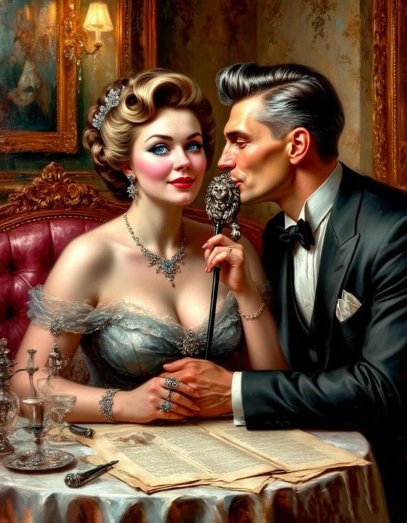 Аристарх и Валентина вошли, сразу притягивая к себе взгляды. Образ идеального франта рядом с эксцентричной, уверенной в себе женщиной казался вызовом самому пространству. Каждый их шаг и жест вписывался в этот живой, динамичный антураж, как будто сцена ждала их появления, чтобы начался спектакль.