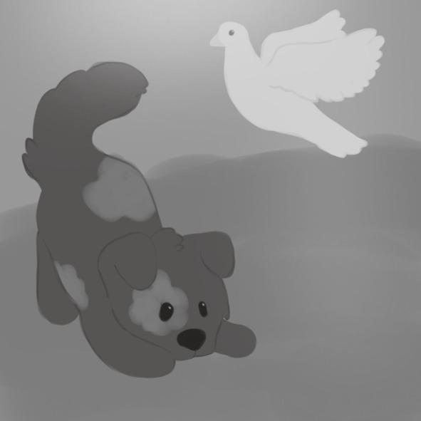 Щенок увидел, как ястреб пронесся с добычей над ним, но белая птица в его когтях так трепыхалась и билась, что хищник не смог удержать ее. Птица вырвалась, но, обессиленная, упала в ручей и начала тонуть.