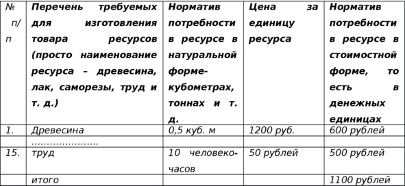 Стоимостная (денежная) потребность в каждом типе ресурса определяется через умножение цены ресурса на норматив его потребности в натуральной форме. К примеру, если древесина приобретается нами по цене 1000 рублей за кубометр, то норматив его потребности в стоимостной форме составит (1000 рублей × 0,5 кубометра =) 500 рублей…