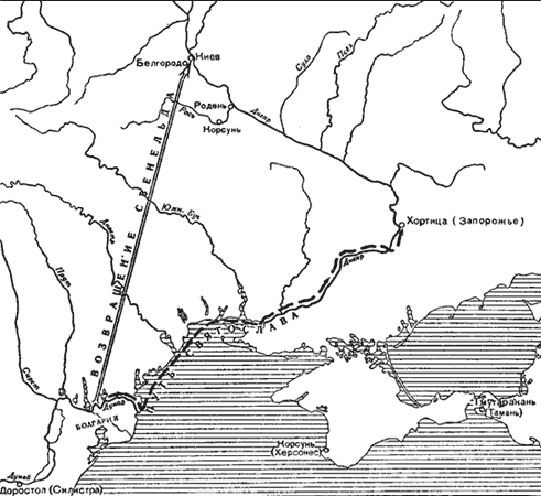 Самая невероятная черта маршрута Святослава состоит в том, что Хортица, как мы помним, лежит за рубежами Руси, в глубине Печенегии. Путь с Дуная на Киев проходит на протяжении 600 километров по печенежской территории! Выбирая этот путь, Святослав зачем-то покинул русскую землю и углубился на несколько сот километров в глубь печенежской (притом, согласно летописи, зная, что с печенегами неожиданно вспыхнула война!). Почему же он избрал такой роковой маршрут? Это возможно только, если прямой путь на Киев внезапно оказался перерезанным! Если внезапным вторжением с востока печенеги захватили Уличскую и Тиверскую земли (точнее, северную и центральную их части).