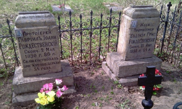 «Протоиерей Гавриил Иоанн Рождественский. Скончался 2 мая 1890 г. 80 лет. Священствовал при Котловановской церкви 54 года». В одной ограде с ним: