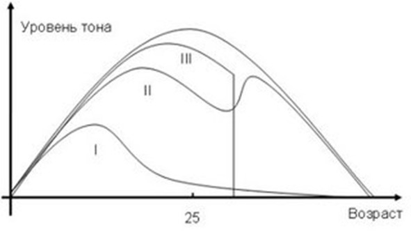 Вообще, динамика тона может быть самой разнообразной. И определяется она различными индивидуальными особенностями или аномалиями в судьбе человека. Ну, предположим, что в довольно раннем возрасте молодой человек пристрастился к нюханию клея «Момент», что, безусловно, очень ограничит возможности его развития и довольно быстро приведет к непреодолимым разрушениям мозга, в результате чего данный молодой человек будет вести полу-растительное существование до конца своих дней (линия I на графике). В жизни могут происходить различные события, в результате которых ТОН может сильно понижаться, но результатом преодоления этих кризисов может быть и существенное повышение ТОНа, иногда приводящее как бы к эффекту продолжения молодости (линия II на графике иллюстрирует ситуацию удачно пережитого кризиса среднего возраста). И наконец, далеко не всегда человек умирает в низком ТОНе, смерть может настигнуть человека и неожиданно (линия III на графике).