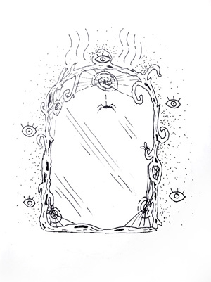 Итак, представьте себе Зеркало…такое всё овальное, покрытое богатым некогда окладом из сусального золота, но ныне облупилось, также и зеркальная поверхность, бывшая когда-то серебряная амальгама скукожилась и изнутри прям дыры как будто. Зеркало всё покрыто паутиной и запылилась.