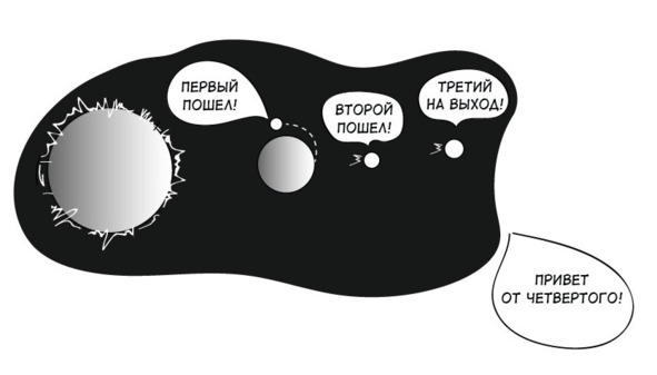 Чтобы понять, как можно посчитать первую космическую скорость, достаточно представить, как будет выглядеть весь запуск: со страшной скоростью подопытное туловище стартует с поверхности. В полёте гравитация и воздух тщетно пытаются его затормозить. Наконец, на орбите он должен «остановиться». Ничего не напоминает? Правильно – это будет замедленное движение. Чтобы совсем не заморачиваться на тему подсчётов – равнозамедленное. Расстояние, на которое летит туловище: радиус Земли. Ускорение, противостоящее нам: g. Расстояние, пройденное при торможении, будет равно: v2.t (как было в кинематике). А нам отсюда нужна скорость. Итого: это будет корень квадратный из произведения g на радиус Земли. Поскольку и то, и другое – числа известные и постоянные, то и скорость будет для всех одинаковая. Если посчитать, то первая космическая скорость получится примерно 7.9 км/с. Вторая космическая скорость – летим ещё дальше, её хватит на то, чтобы вообще преодолеть притяжение Земли и улететь бороздить просторы Солнечной системы. Для Земли она составляет 11.2 км/с. Считается она уже из закона, которым наверняка уже прожужжали все уши, – из закона сохранения энергии. (О нём – ближе к концу механики, сейчас пока не грузимся.) Третья космическая скорость позволяет ухнуть ещё дальше – вылететь вообще за пределы Солнечной системы, то есть преодолеть притяжение Солнца. Она может меняться, потому что космический корабль должен будет уворачиваться от вертящихся планет и тому подобных посторонних предметов, пролетающих мимо в космосе. В среднем она составляет где-то около 42 км/с, но вообще может быть от 16.6 до почти 73 км/с. Наконец, есть ещё четвёртая космическая скорость. Она нужна тогда, когда захочется вышибить наш предмет с Земли настолько сильно, чтобы он преодолел притяжение самой нашей галактики Млечный путь. (Если фантазия разыграется до таких вселенских масштабов…) Её подсчёты ведут уже в какие-то заумные дебри современной физики; говорят, что она непостоянна и зависит от положения тела в галактике. Известно только, что в районе Солнечной системы нужно разогнаться аж до 550 км/с, чтобы иметь хоть какую-то надежду на полный улёт. Улёт в настолько открытый космос, что и представить трудно.