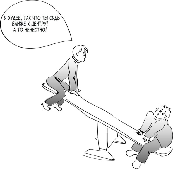 Дальше опять следует куча предположений, которые проще всего себе представить так. Вот у нас есть детские качели, на которых садятся два человека – доска на подставке с двумя сидениями на краях. Подставка намертво закреплена – не отдерёшь, – а к ней прикреплена палка, которая может подниматься-опускаться, как рычаг. Или, по-умному, это получается всё то же вращение. И на сиденьях сидят дети. Ради прикола прикинем, что они идеальные близнецы – полностью одинаковые по массе, силе и т. д. и т. п. Тогда, если всё это перевести в заумные физические понятия, получается так: подставка, она же точка опоры – это ось вращения. Вокруг неё вращается наш «рычаг». Дети – это твёрдые тела. Господа знатоки, внимание, вопрос: так при каких же условиях дети будут находиться в равновесии? За такую формулировку на экзамене по физике могут заколоть заживо. В равновесии должно находиться то, что может вращаться! То есть, в данном случае это наша палка качелей, которая закреплена на подставке. Именно её придётся теребить.